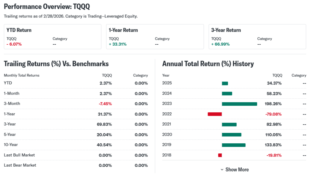 Leveraged ETFs like TQQQ skip standard P/E or EPS. Focus on expense ratio 0.95% (waived partly to Sep 2026).