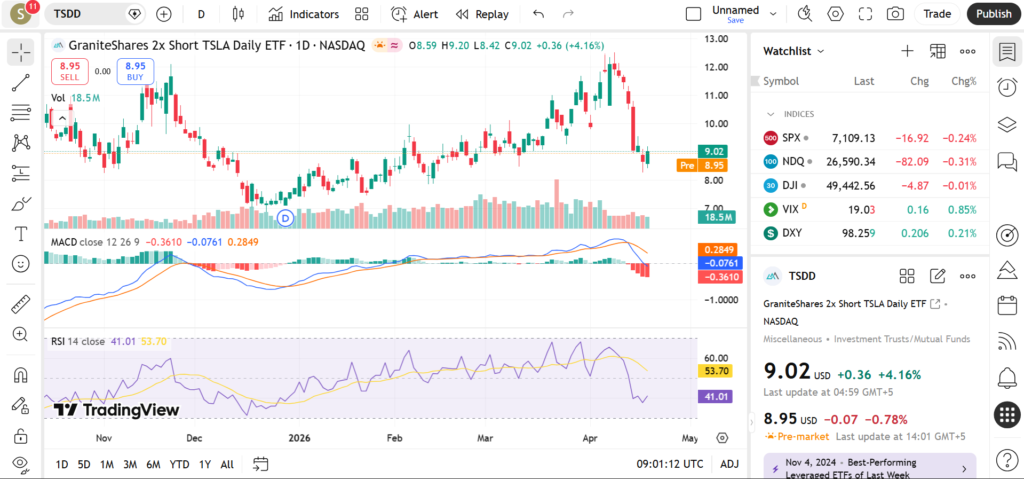 As of the latest available market data, TSDD ETF price is around $9.00–$9.45 range.