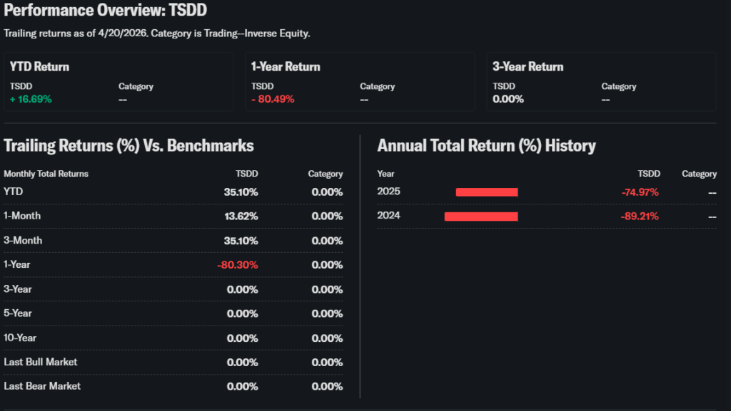 TSDD ETF is a high-risk leveraged inverse ETF designed for short-term trading.