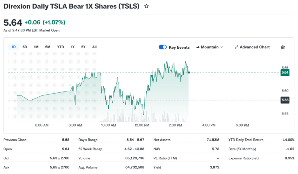 TSLS ETF closed at 5.58 last market session, down 3.46%. This reflects Tesla’s 3.44% gain to 405.94. Data comes from recent Barchart updates.