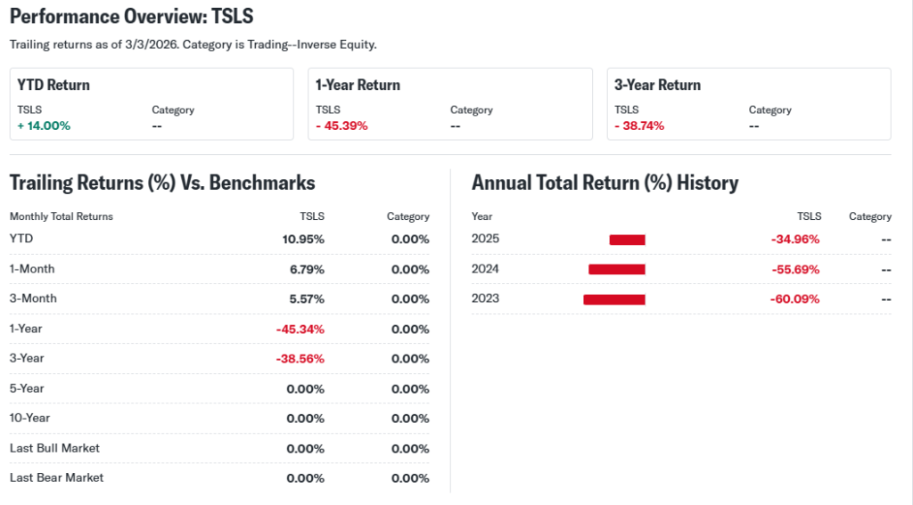 Tesla rallies crush TSLS. Recent +3.44% TSLA day meant -3.46% loss. Compounding erodes value over time.