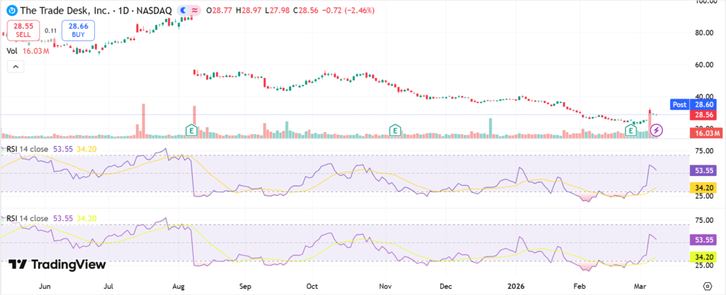 As of last market close on March 5, 2026, TTD stock price stood at $29.80, up 18.4% or $4.63 that day. The 1-day gain followed broader tech recovery. Over five days, it rose 5%, showing short-term bounce.