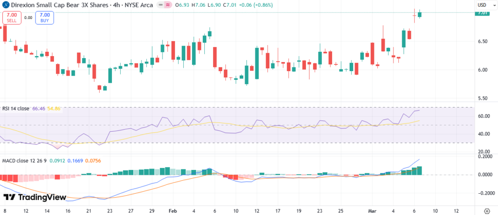 Trading volume spiked to 197.82M on March 5, up from prior days. High volume confirms conviction in moves, aiding TZA technical analysis.