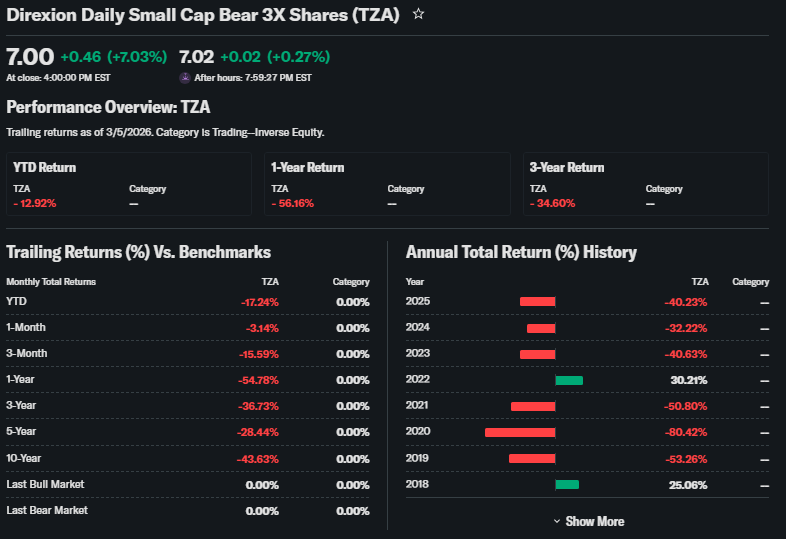 As of last market close on March 5, 2026, TZA ETF traded at $6.68, up 2.06% that day. One-day performance showed gains amid small-cap dips.