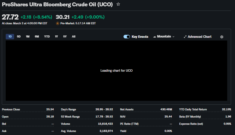 The 5-day trend shows upward momentum after a brief dip, with gains near 5%. Over one month, UCO ETF price rose roughly 14%, driven by crude rallies.