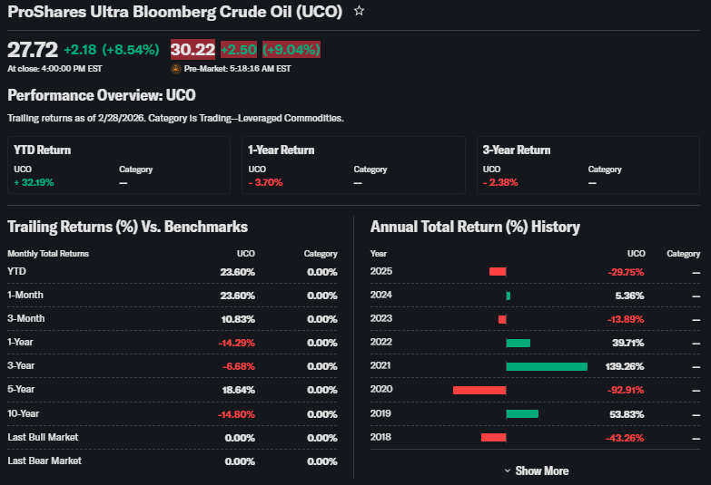 Expense ratio at 0.95% eats returns over time. Compare to unleveraged USO: UCO amplifies moves but decays in sideways markets.