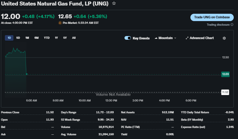 Over five days, UNG ETF shows volatility with a net drop from recent highs near $14. Year-to-date, it has lost 24.8% amid mild winters, but gained 6.4% since mid-October 2025. The one-month trend dipped 6% from $14.68 peaks, while three- and six-month trends remain bearish at -16% and lower, per falling futures.