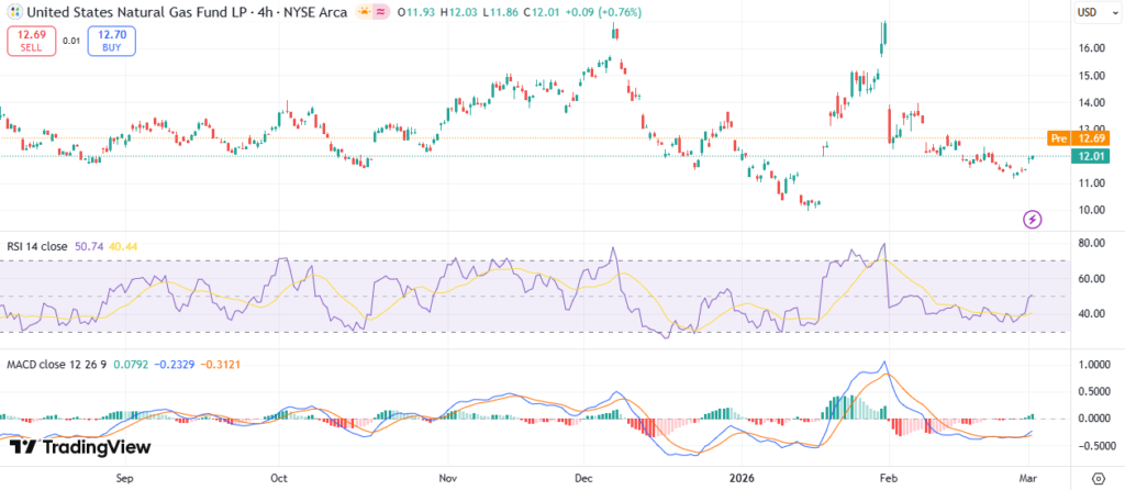UNG ETF closed at $13.83 on March 2, 2026, up 4.17% from $13.22 the prior day. This one-day gain reflects short-term buying on cold weather bets.