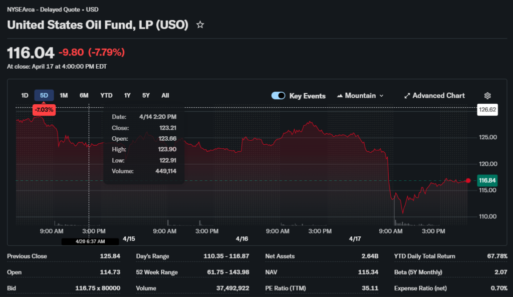 As of the latest market close, the USO ETF price is approximately $78.40. The ETF showed mild volatility during the session.