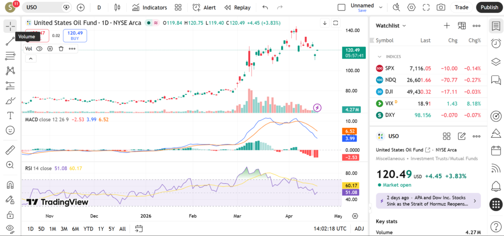 The 3-month trend shows strong gains driven by energy market demand. Over the last 6 months, USO ETF has remained volatile but generally upward.