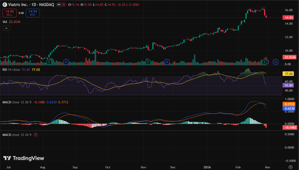 VTRS stock closed at $16.08 on February 25, 2026, the last trading day before Q4 data. It ranged from $15.14 to $16.47 that day. The 52-week high hit $16.47, while the low was $6.85.