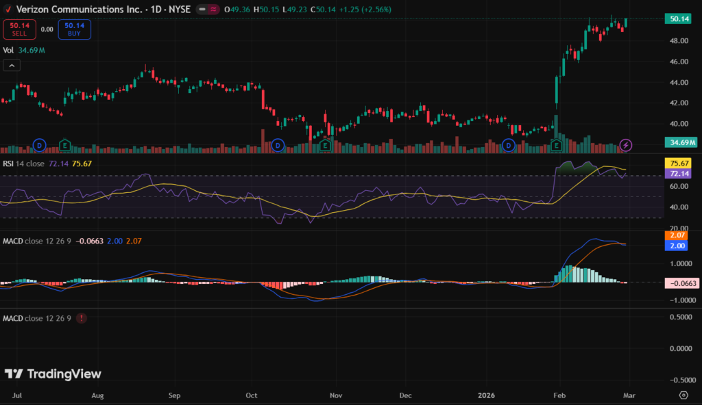 VZ stock closed at $50.14 on March 2, 2026. It rose 2.56% in the last day amid positive trading volume.