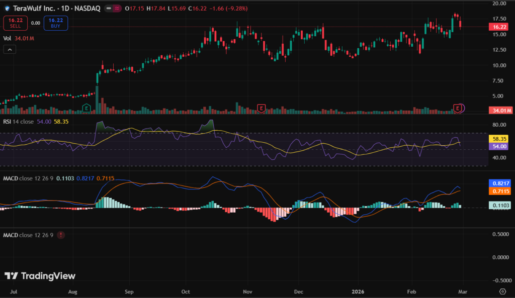 WULF stock price $16.22 down 9.28% after-hours. Q4 rev $35.8M miss $44M, loss $126M. Is WULF stock a buy? Targets $22 avg, RSI 73 overbought. FY26 rev $388M est.