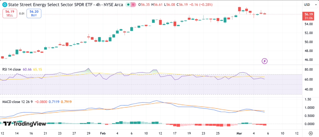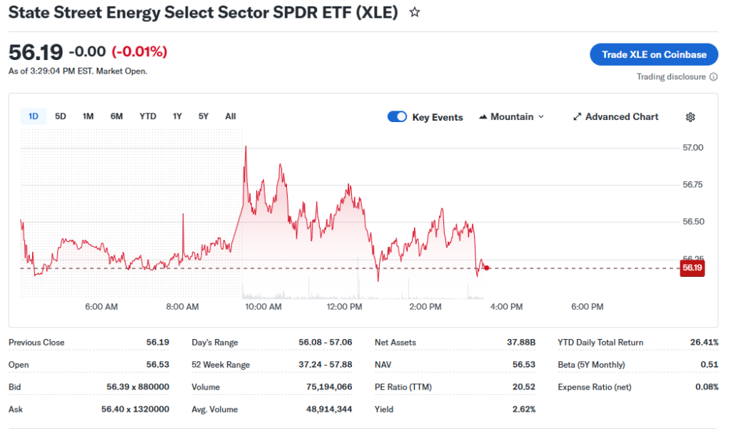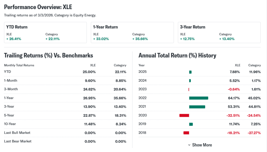 As of the last market close on March 3, 2026, XLE ETF price stood at $56.52. It gained 1.2% in the prior day amid rising crude prices. Over five days, it rose 2.5%, showing short-term strength.