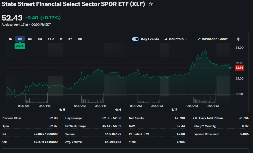 As of the latest market close, the XLF ETF price is approximately $41.20. The ETF declined slightly by around -0.5% during the session.