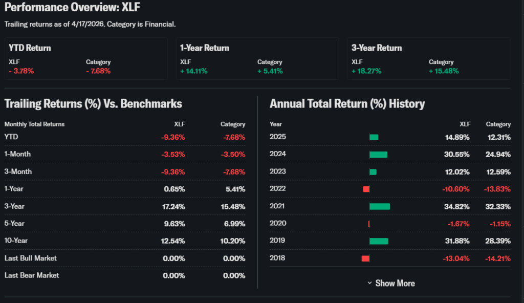 Year-to-date, XLF ETF is up approximately +3%, reflecting stable but limited growth.