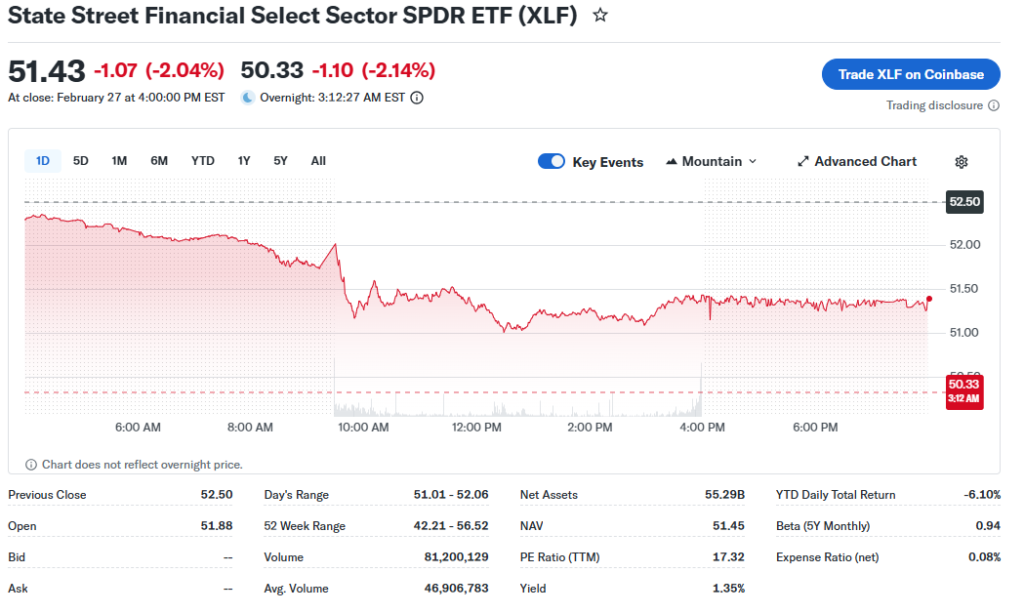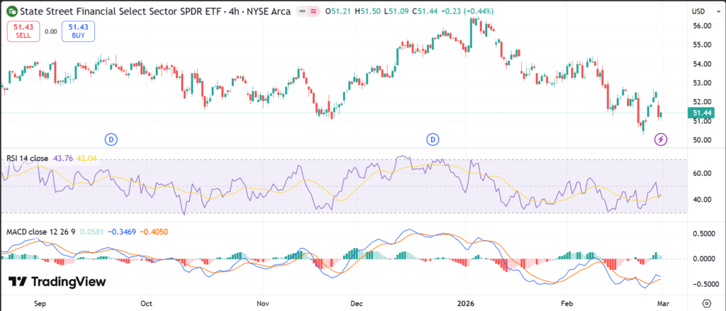 XLF ETF closed at $51.29 on the last market session. It sits 0.5% above the day’s low and 1.9% below the high.