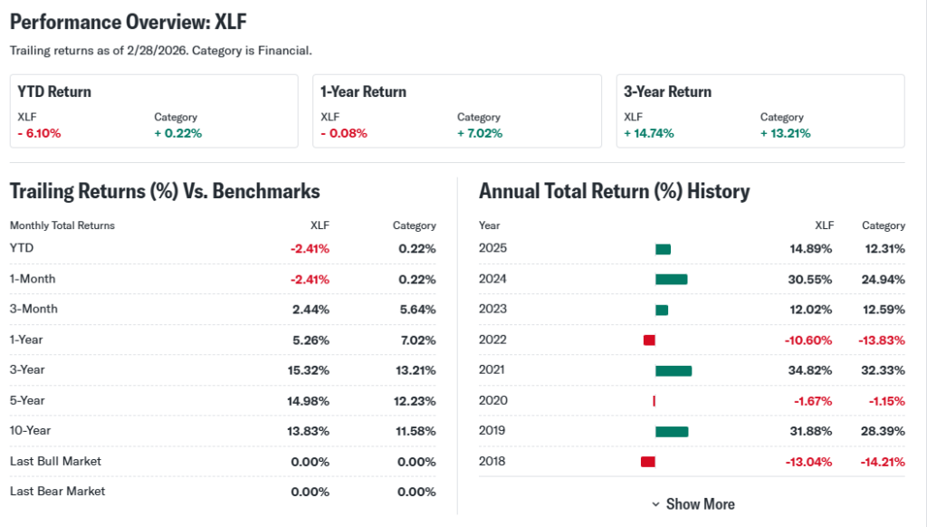 Earnings lifted XLF ETF 11.7% in 2025 but 2026 pullback followed macro news.