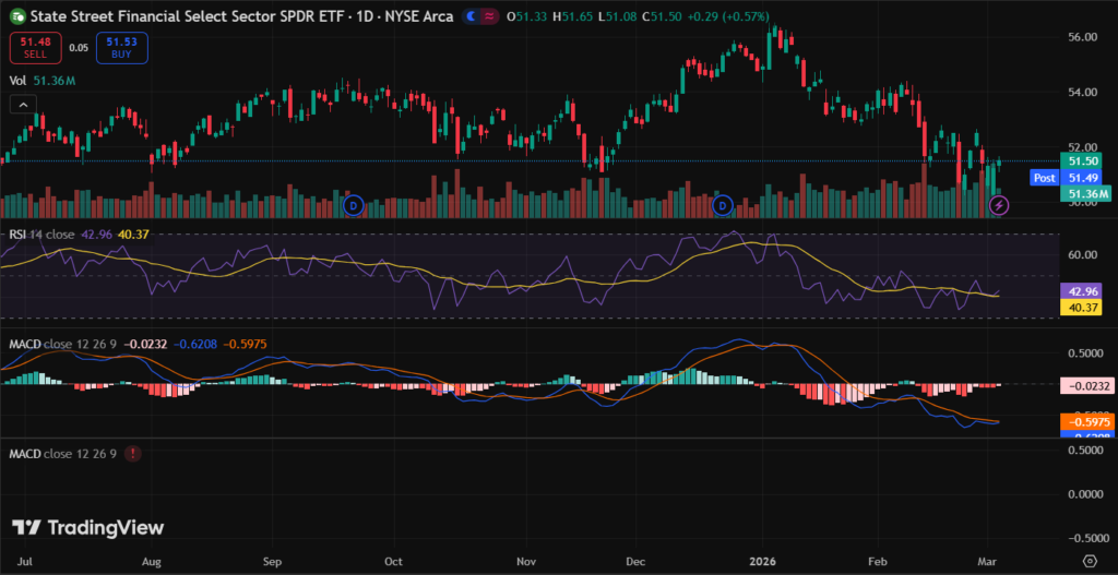 Using last market close on March 4, 2026, XLF ETF closed at $51.21. It edged up 0.17% that day. Range spanned $50.09 to $51.47.