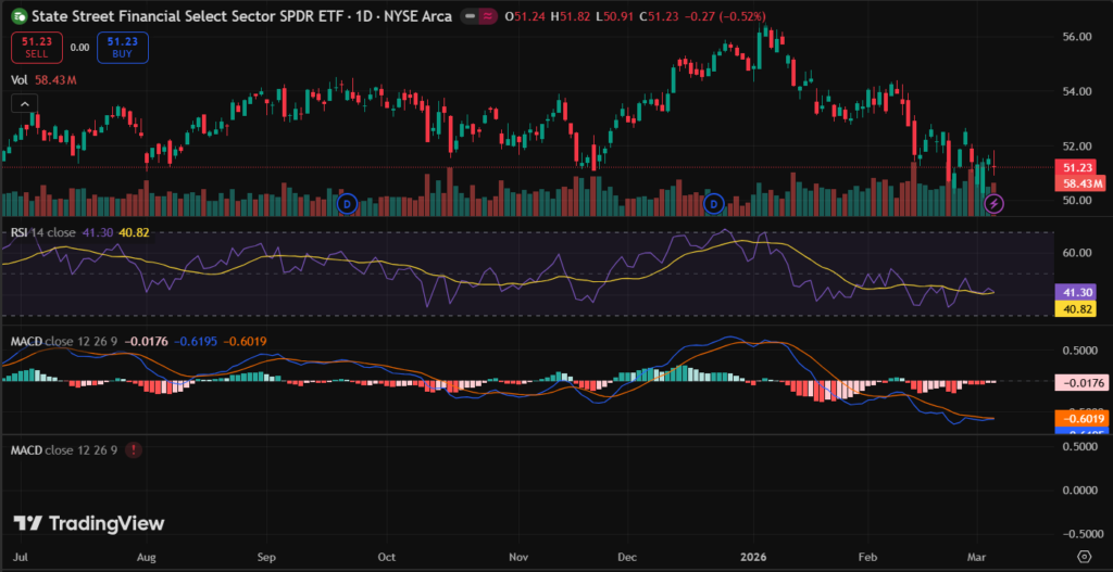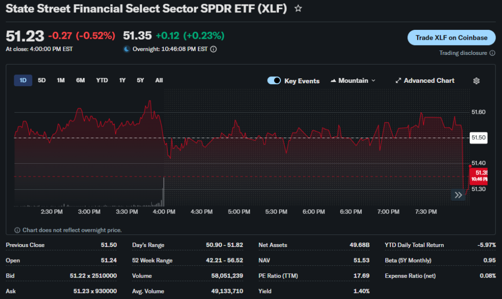 XLF ETF closed at $51.50 on March 4, 2026, up 0.57% that day.